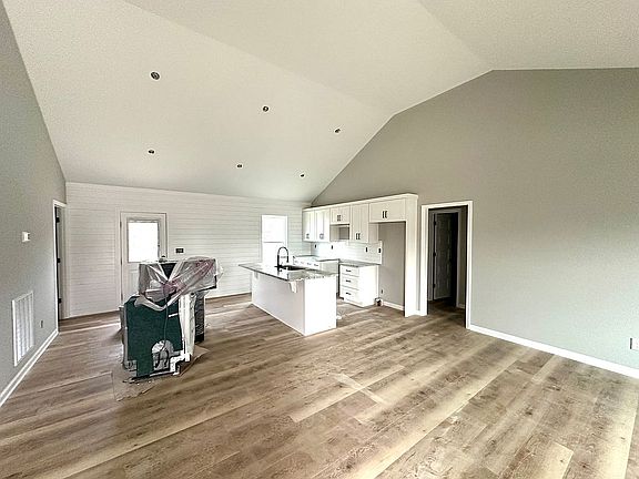 Step outside to the large back deck, an ideal space for entertaining or enjoying tranquil moments surrounded by nature. The front porch, adorned with sleek black rails, adds a touch of elegance to the exterior. Inside, the living area boasts vaulted ceilings, creating an open and airy atmosphere.