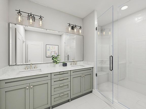 Contemporary deluxe style. The Amberley's inviting covered entry and impressive two-story foyer reveal the lovely turned stairs, and views to the casual dining area and soaring great room with rear yard access. The well-designed gourmet kitchen is enhanced by a large center island with breakfast bar, plenty of counter and cabinet space, and sizable pantry storage. The sophisticated primary bedroom suite is complete with dual walk-in closets and spa-like primary bath with dual-sink vanity, large luxe glass-enclosed shower with seat, linen storage, and private water closet. Secluded on the second floor, secondary bedrooms feature walk-in closets and are central to a generous loft with full hall bath access. Additional highlights include a versatile office off the foyer, convenient powder room, centrally located laundry, and ample additional storage.