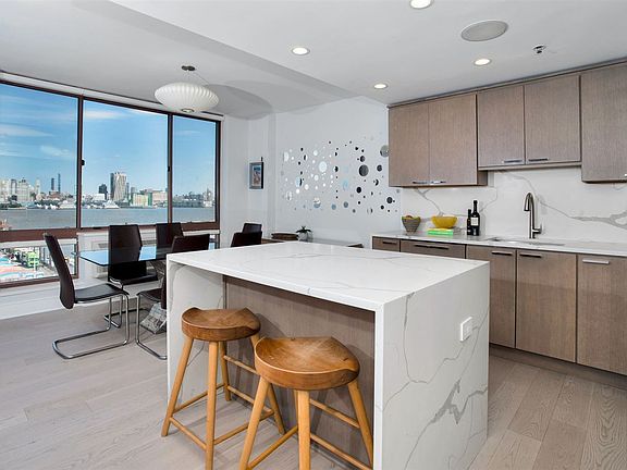 Direct panoramic views of NYC & the Hudson River in this impeccable & meticulously renovated unit in a prime, Hoboken waterfront location. Enjoy breath-taking views from every window. Coveted corner unit with 3 bedrooms/2.5 bath filled with natural light and modern, top-of-the-line finishes and custom details. Open layout in an exquisite designer kitchen facing unobstructed NYC views equipped with a package of appliances including a Wolf Stove & induction cooktop, SubZero refrigerator surrounded by elegant Quartz countertops and backsplash. Other features include Hunter Douglas electric blinds, Lutron lighting, spa-like bathrooms, Toto toilets, Hearth Cabinet ventless fireplace, ample closet space, well proportioned rooms and wide plank oak hardwood floors throughout. This building couldn't be more convenient to the ferry to NYC, shops, parks, marina, waterfront promenade, Pier 13 and restaurants. 24/7 Concierge, gym on 3rd floor, landscaped courtyard on 4th floor with children's play area, dual elevators, 2 outdoor pools (fee) and on-site garage parking (fee). Enjoy luxury living with unparalleled NYC views in this perfect waterfront location next to everything this city has to offer.