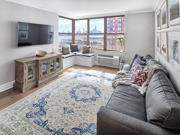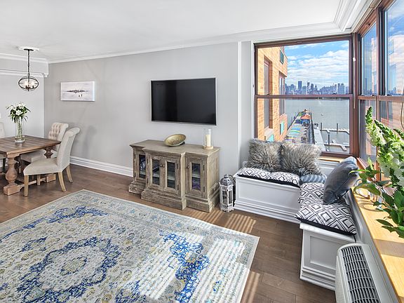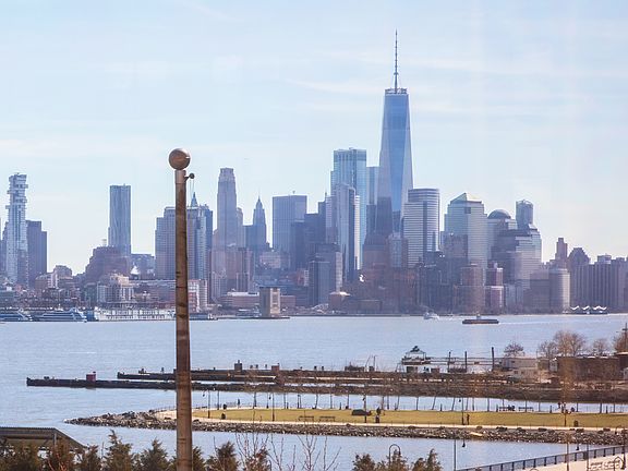 On top of Hoboken's premiere waterfront promenade, come inside this impeccably renovated home. Attention to detail is observed from every corner inside this 2 bedroom and 2 bath south facing home, perched above the tree-line allowing unobstructed views of lower Manhattan from every room. Gleaming new hardwood floors & crown moldings throughout, and modern solid doors with all new hardware are just a few details that must be noted. The living & dining area seamlessly flow with abundance of space, a perfect custom built-in storage bench at the foot of the window allows guests to capture the view. Kitchen boasts illuminated countertops, stainless steel appliances and gorgeous backsplash. Master Bedroom includes a built in, custom walk-in-closet, private marbled bath with basket weave flooring. 2nd Bedroom features built-in with Murphy bed and ample closet space. Amenities & lifestyle in most desirable neighborhoods building offers 24/7 Concierge, gym on 3rd floor, landscaped outdoor space for children and play room, membership avail to two outdoor pools and onsite garage rental parking. Prime waterfront location next to shops, restaurants, parks, pier, marina and ferry & NYC bus. Elegant home has it all and will impress all onlookers.
