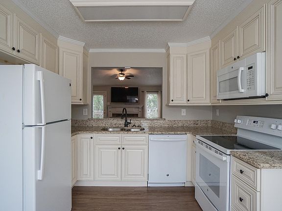 REMARKABLE UPDATES THROUGHOUT THIS VERY SOUGHT AFTER SINGLE STORY TOWNHOME ! ALL BEDROOMS AND LIVING AREAS ARE ON ONE LEVEL PLUS A ONE CAR GARAGE WITH A STORAGE ROOM AND THERE IS A CONVENIENT YARD DOOR THAT LEADS OUT TO THE BACK YARD WITH MATURE TREES. There is also additional parking on the driveway. This amazing kitchen has had new cabinetry down to the custom pull out spice rack and granite counter tops added in recent years. You will enjoy morning coffee in the bay window breakfast nook which also adds brilliant natural light to this area. All appliances convey including a huge flat screen TV over the Gas Log Fireplace and Mantle. Luxury vinyl plank flooring throughout all areas that provides a seamless look all the way through. The great room has a vaulted ceiling that offers a nice architectural detail and a pass through to the kitchen. This is a popular end unit and a must see in this sought after area. Both bathrooms also have granite counter tops.