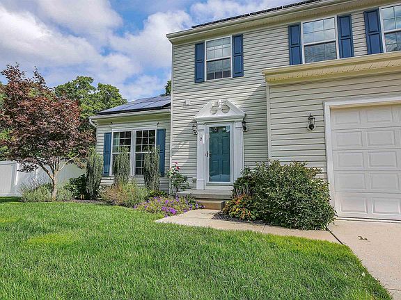 This beautifully upgraded home has 4 bedrooms, 2.5 baths and features a Southern exposure, 9' ceilings on the first floor, a stunning new kitchen (2022) with quartz countertops, waterfall edges, stainless steel appliances and 42" cabinets. The sunroom is nice and bright and offers plenty of room for a large dining room table. The family room has the optional 2' bump out for added space. New laminate flooring throughout the home. Upstairs features a large master suite with walk in closet, tiled garden tub and shower. The basement is partially finished and has a huge storage area. This home also has an upgraded water filtration system ($8,000) and reverse osmosis system. The solar panels are super efficient. In this day and age of high electric bills, the owner's August 2024 electric bill was $6. (Solar lease is $130/ mo.). The fenced in yard backs up to the woods for extra privacy. Corner property in immaculate condition. Great neighborhood. Convenient location.