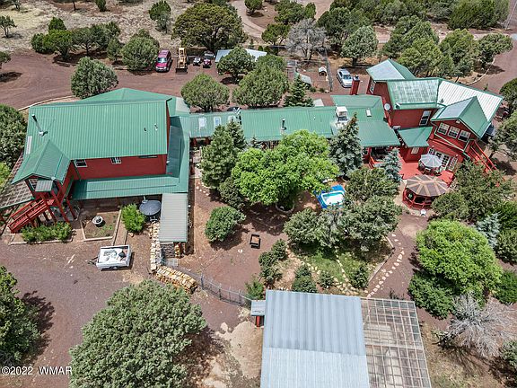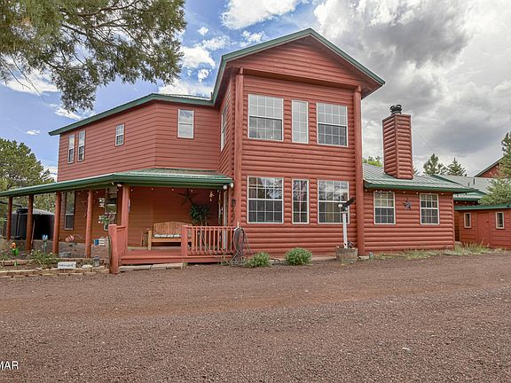 TWO HOMES IN ONE. Privacy, seclusion & at the end of the road w/ property fully fenced & gated - this 5 bed / 5 bath home & its 6,527 sq ft offers 2 full kitchens, 2 full laundry rooms, new carpet installed in south side of the home, new flooring & toilet in south upstairs. 3 new vinyl windows coming for south upstairs. The 3 woodstoves will become 2 woodstoves & 1 pellet stove before COE. 2 lpg forced air furnaces & 4 freestanding lpg heaters throughout the home. Master Baths 1 & 2 have heated floors. There's a potential media room. Separate bunkhouse- room only, greenhouse & 7500 gallon rain catch system. 3 separate dog kennels, back 2.5 acres separately fenced. 2-car attached garage. Water from Coconino Aquifer. Seller is a licensed real estate agent in AZ & is firm on price. The home is hardy board & log sided. Granite counters in the main kitchen & both master baths. Panoramic views to amaze - sunrises & sunsets are spectacular. Internet solutions are 4 fold - Frontier Communications DSL, Hughes Net, Cell one Microwave service, Verizon cell service and Starlink.