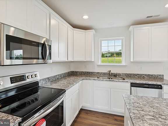 Stone to Grade Front & Carriage Style Garage Door shows extra curb appeal. LVP Flooring in Foyer, Closet, Kitchen/ Breakfast, Family Room & Dining Room. Your New Kitchen is complete with Granite Countertops, Stainless Steel appliances, Recessed Lighting and Island for Entertaining. Upstairs- enjoy a laundry room on the bedroom level .The Owner's Suite has a private En Suite, with Confort Height Dual Vanity, and a large walk-in closet. Schedule your showing today and view this home, our decorated Model and other availiable Homes in our Community. Up to $10,000 Closing Assistance with the use of Builder preferred Lender and Title Company. Exterior Photo of Sky, Grass, and driveway has been digitally enhanced.