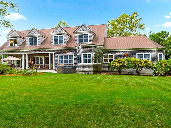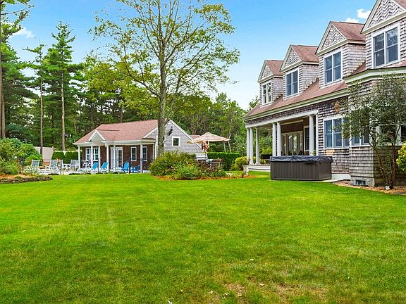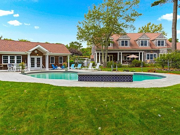 Stunning Alan A. M. Stern Cape Cod design with meticulous details, custom built-ins, recessed lighting with all the upscale features in peaceful estate-like setting. Over 4,600 sf of luxury living located on over 1.6 acres with 2 car attached garage. Separate 3 car detached garage with stunning 900 sq ft pool house above. This spectacular home offers tons of natural light, living room with vaulted ceilings, beautiful bannisters, balconies, and a fabulous gas fireplaced wall. An amazing kitchen featuring both Subzero fridge & freezer, Jenn-Air cooktop/grill, instant hot & cold filtered water, granite counters, wine fridge, open kitchen bar, and a breakfast nook. A formal dining room, office, laundry room, 1/2 bath and the first-floor primary suite with 3 enormous closets and private bath finish the 1st floor. X-large basement with new essential auto generator and gym. The outdoor sanctuary has saltwater heated pool. Just mins to beaches and bridge and short bike ride to Cape Cod Canal.