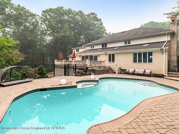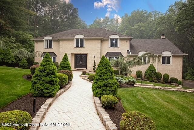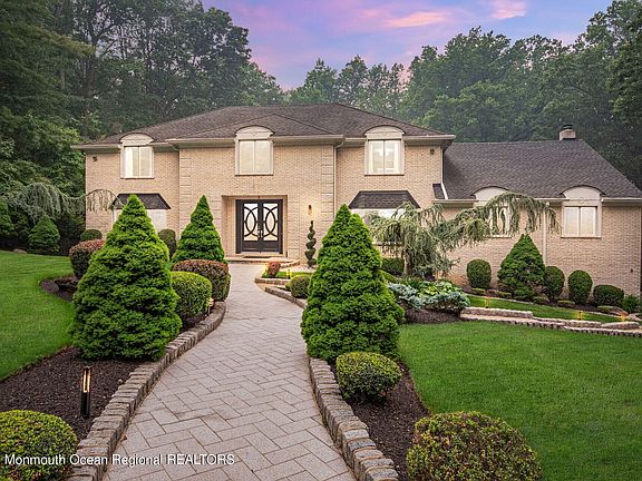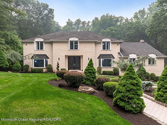 This stunning, custom-built brick colonial is nestled in a prime Holmdel community, boasting elegance and superior craftsmanship akin to Country Woods. With approximately 5500 square feet of living space, it offers a grand 2-story entry foyer adorned with hardwood and marble flooring, complemented by a remarkable floating staircase. The entire house showcases hardwood and marble accents, with the added charm of 3 fireplaces. The expansive custom gourmet kitchen is a culinary enthusiast's dream, featuring top-of-the-line stainless steel appliances and a spacious eat-in area. Step outside onto the custom veranda, complete with cement balusters, and take in the picturesque view of the beautiful backyard, featuring a Gunite pool with a spa. The abundance of natural light illuminates the residence, highlighting the great room with its cozy fireplace, custom wet bar, and loft area. The open floor plan lends itself perfectly to both everyday living and entertaining. The generously sized bedrooms provide ample comfort, while the updated primary bathroom adds a touch of modern luxury. This meticulously maintained property rests on 1.26 acres, boasting a park-like setting enhanced by professional landscaping. The list of features is extensive, making this property an absolute must-see. Additionally, its convenient location offers easy access to GSP, train stations, ferry services, buses, and local shopping destinations.