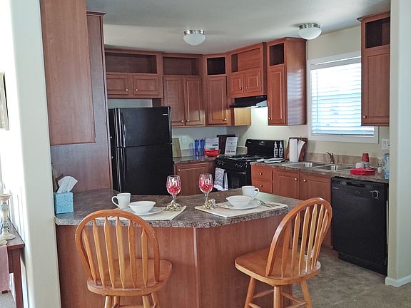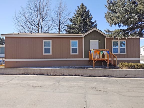 This home features all black kitchen appliance (gas cook stove), natural gas furnace heating (no A/C), carpet and vinyl tile, laundry room with hook-ups, a spacious master with walk-in closet and private bath. The numerous windows have great views, especially of Castle Rock right out your front door. Several large trees provide the perfect amount of shade. Onsite manager with regular office hours and monthly events. Also features a covered carport with attached shed that has electricity and an additional concrete parking area allows up to 2 vehicles. There is space to build a large deck off the back and zeriscape (rock) landscaping provided. Must also qualify to rent the space in the community. Must be owner occupied and not for use as a rental property.