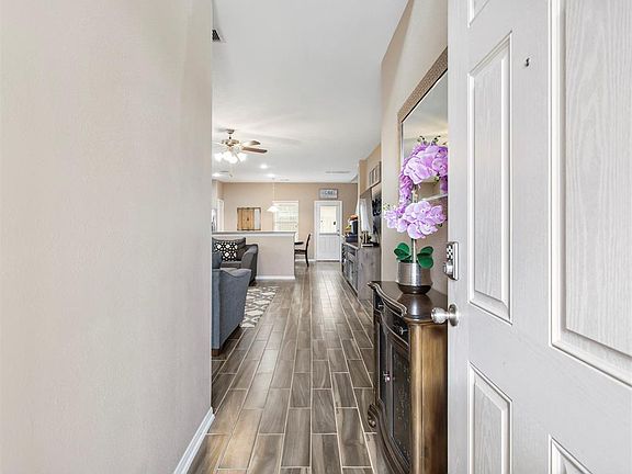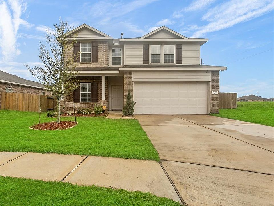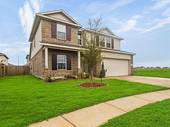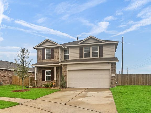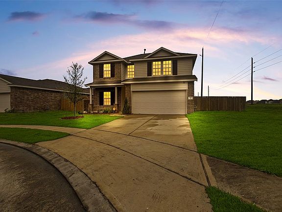 Great two story in popular Rodeo Palms! Brick exterior with attractive Hardy plank contrast. Set on a corner cul de sac lot with well-manicured lawn and covered front porch. Porcelain tile flows through the first floor living areas. The foyer with vaulted ceiling reveals a spacious open floor plan with private study behind French doors. Cozy kitchen with granite counters and subway tile backsplash features a gas range, recessed lighting and large pantry. Nice breakfast bar overlooks the large den with sunny windows. Spacious laundry with shelving. Owner's retreat with double vanity, tub with separate shower and walk in closet. Upstairs game room shares the space with the spacious secondary bedrooms and bath. Lush, fenced backyard with covered patio.