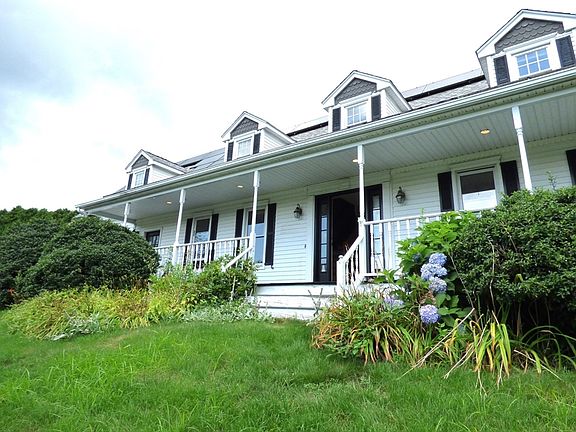 Beautifully located large cape in a country setting with the right features inside and out. Enter from farmer's porch to find inviting entry leading to large dining rm with hardwood flrs open to bright kitchen with cherry cabinets, SS appliances and quartz counters. Full bathroom with standup shower and washer and dryer. Living rm is huge with floor to ceiling stone fireplace and slider onto patio with canopy perfect for cozy gatherings.Upstairs are three bedrms, main bedrm has hardwood flooring and large walk in closet with built ins. Bathroom is large and has tub shower. Added bonus is the unfinished room above the garage with bright windows and high ceiling ready to finish. Basement is open and has high efficiency gas heating boiler/hot water tank. Mini splits in the living room, master bedroom, 2ndbedroom, and basement make it nice and cool all summer long and toasty when used for heating. Solar owned (APO) and providing credits. Outside are beautiful plantings, pavilion, shed.