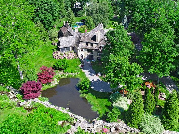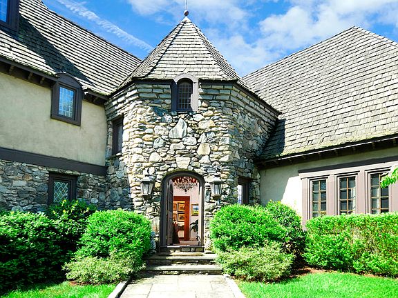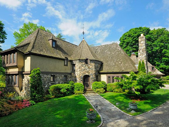 Very special custom built, 5 BR, 6.2 BA stone & stucco French Country home nestled in an idyllic setting just minutes from Greenwich Ave. The gated private driveway winds through the mature landscaping, past the pond, to the level yard with pool & gardens. Custom features throughout include woodwork, leaded glass windows, hand hewn beams, balcony library hidden behind a bookcase door & octagonal turret entry foyer. Dramatic vaulted living room, generous formal dining rm, gracious kitchen/family rm, paneled library & 1st flr master 2 baths. 2nd Flr master + 2BR (1 sitting rm. Guest/nanny/in-law apartment. Finished walk out LL family rm, stone wine cellar, exercise rm & incredible storage rm. 3-car garage + 1-car garage storage/gardening bays. A truly exceptional property.