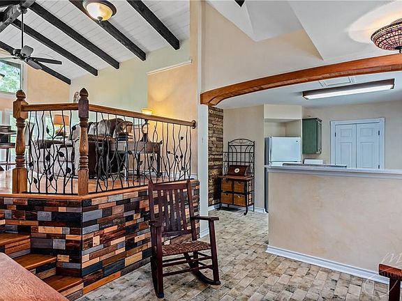 You'll love this remodeled 2BR/2BA cottage with vaulted open-beam ceiling, vintage wood floors and unique architectural details. Spacious kitchen with quartz counters and living room is open concept for easy entertaining. The master bedroom is on the main level and a guest bedroom is on the lower level with a private entrance that opens onto the wrap around deck. One bath has a shower and the second has a vintage porcelain tub/shower from a historic Eureka Springs hotel. Two spacious walk-in closets have shelving. The utility room is conveniently located off the kitchen. A large workshop with concrete floors is on the ground level along with a separate storage room with concrete floors. Wonderful back deck overlooks a wet-weather creek that flows from Little Lake Eureka. Great neighborhood for walking with beautiful rock bluffs, several springs, and architecturally interesting homes. Off-street parking for two to three cars. Easy walk to your favorite downtown shops, galleries and restaurants