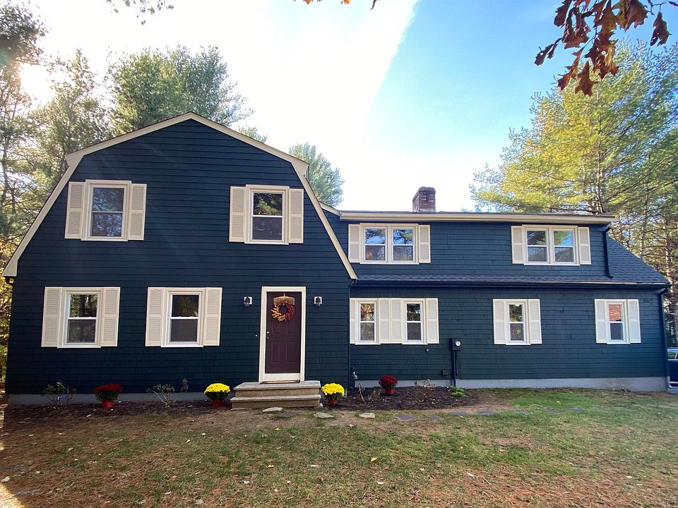 {Woodward Estates} NEWLY RENOVATED! Well-established neighborhood, bordering Bedford, NH, and situated on a large corner lot. Stately Gambrel, 4 bedrooms, 3 baths, finished basement with about 3,000 SF, and a side-load 2 car garage with direct entry. The first floor offers first-floor laundry, ½ bath, and a modern open-concept living and kitchen space complete with stainless steel appliances with Air-Fryer Oven, granite counters, peninsula bar seating, and a beautiful wood-burning fireplace. Off the kitchen is the dining area with built-in cabinets, leading to a nice formal living room. The second floor is amazing with tons of space! The Primary bedroom has a large sitting area perfect for a nursery or office, a full bathroom, a slider with balcony, and plenty of closet space. Another Primary Bedroom with access to the full bathroom, and 2 other nice size bedrooms complete with attic storage. The finished basement offers a living area with a studio room that could be used for podcasting, recording, and music. Excellent location and minutes to Route 101 & Route 3. Offering Natural Gas, Public Water, and Private Sewer. New roof, New windows, New furnace, New flooring, New bathrooms, Freshly painted INSIDE and OUT! Exceptional neighborhood situated on a large corner lot showcased in the middle of two cul-de-sacs with no outlet.