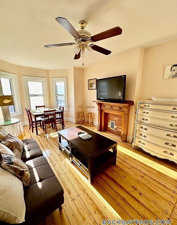 Spacious sun-drenched living room with designated dining area, bay windows, and decorative fireplace. Generously-sized bedrooms with ample closet space.