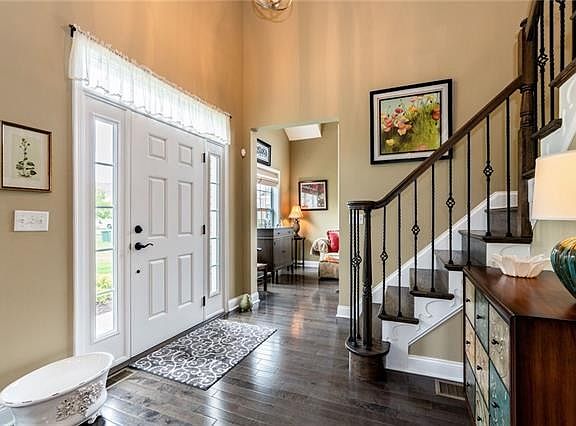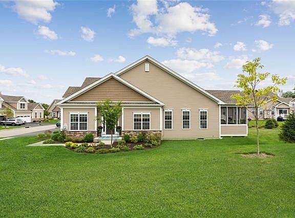 Gorgeous ALDER model end unit shows like the model. Spacious two-level living in an ACTIVE-ADULT 55+ gated community, resort style amenities. Home includes extensive upgrades. Custom top down bottom up shades, vaulted ceilings, ceiling fans, expanded Great Room, expanded First Floor Master BR suite featuring large walk-in closet and private Master Bath with custom shower and marble, upgraded hardwood floors throughout, custom 6 panel wood doors, custom paint throughout including garage and basement, alarm system with 2 panels at Master bedroom and garage, upgraded granite countertops, gourmet stainless steel Kitchen Aid appliances, pantry cabinet, upgraded shaker soft close cabinets, recessed lighting, under the cabinet lighting, upgraded light fixtures, water softener, commercial grade dehumidifier, all oak custom staircase with iron balusters extended around the upstairs loft, large finished walk-in upstairs storage closet, second BR upstairs with WIC and full Bath. Access the spacious, manicured back yard from the beautiful screened in porch with custom 10'x20 stone patio! Enjoy the clubhouse, with outdoor heated pool, bocce ball, tennis, yoga room, billiards room, and more. Lawn care and snow removal from driveway to front door included. Like new, without the wait of new construction.