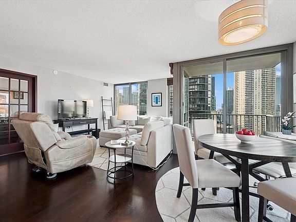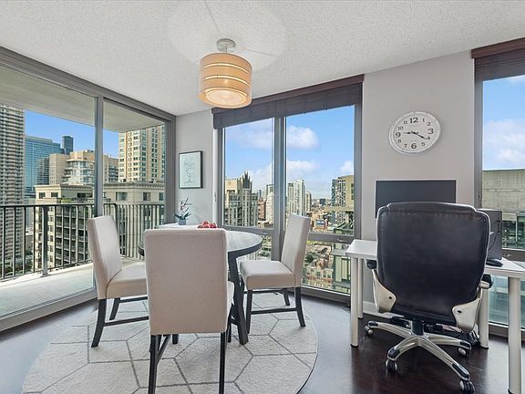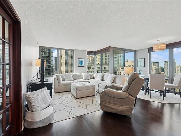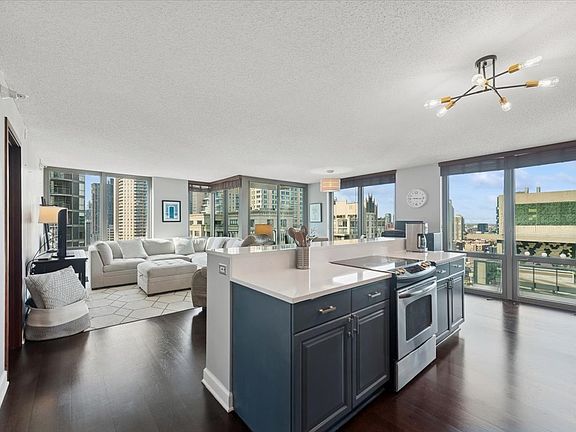 Welcome to this beautiful south/ west corner 2-bedroom, 2-bathroom condo with a private balcony in the heart of Chicago's River North neighborhood ! You can't beat this location, just steps from the shopping on Michigan Ave. This well maintained condo offers an open floor plan with floor-to-ceiling windows that allows for amazing city views and tons of natural light. The condo has been recently renovated and the features include white quartz counters, modern cabinets, stainless steel appliances, designer backsplash & fixtures, full sized washer & dryer, beautiful espresso-stained hardwood floors throughout, and a large island that's great for entertaining. The private balcony looks straight down Chicago's iconic State Street and is a perfect place to gill or enjoy the beautiful Chicago skyline and sunsets. Retreat to the large primary bedroom with its en-suite bath and large walk-in closet. The fully enclosed second bedroom is located off of the living room and is great for guests or for a home office. Additional storage unit included, Parking is an additional $25K. The full amenity building offers 24 hours door staff, a spectacular rooftop deck, a state-of-the-art rooftop fitness center, a hospitality room, and on-site maintenance. Located in one of Chicago's most desirable neighborhoods, you are just steps from the lake, world class dining, shopping, theaters, Northwestern Hospital, public transportation, highways, and other cultural attractions.