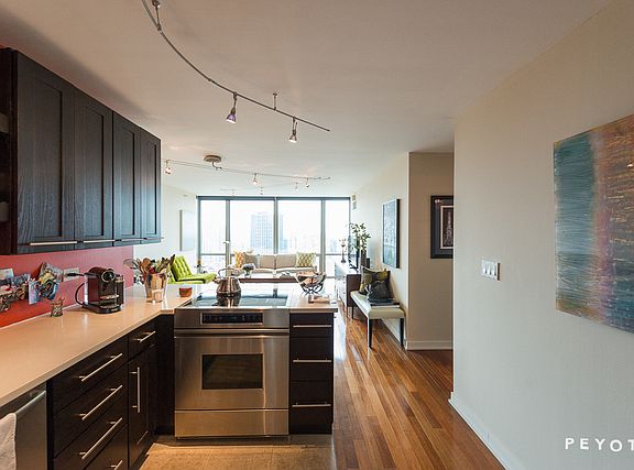 Rarely available 2br (2nd bedroom is not enclosed) and 1bath condo unit in the heart of River North. Bright and sunny west facing unit on high floor with spectacular views of sunset. Unit features hardwood floors throughout, stainless steel appliances, quartz counter tops, California closets in both bedrooms, remodeled bathroom, washer and dryer in unit, designer sun shades and much more. Building features 24r doorman, fitness center, and rooftop sundeck. Walking distance to shopping, bars, and restaurants.
