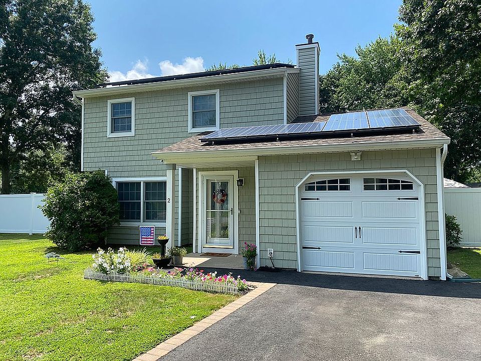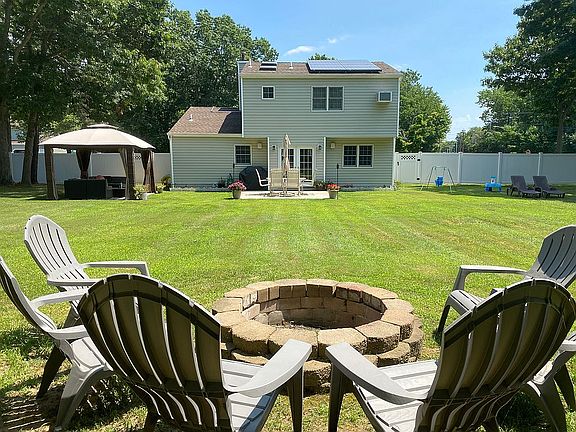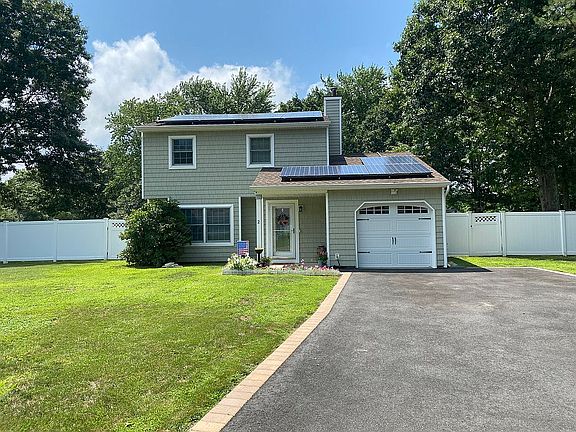 For sale by owner: 3 bedroom colonial offering 2.5 bathrooms on flat 0.69 acre lot backing up to tree farm. Living room, dining room, kitchen w/ SS appliances, pantry, 1/2 bathroom, laundry room, and 1 car garage on 1st floor. French doors lead out to back patio w/ outdoor speakers and large, fenced in backyard w/ fire pit and 14’x8’ shed included in sale. Master bedroom/recently updated master bathroom, 2 additional bedrooms, and 1 additional full bathroom on 2nd floor. Crown molding throughout, new carpet on 2nd floor. Home features Andersen windows, solar panels, natural gas, and central A/C. Brand new driveway w/ stone paver border and new garage door. Low taxes, desirable neighborhood, close to schools, easy access to LIE.