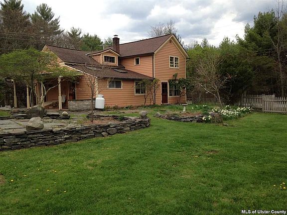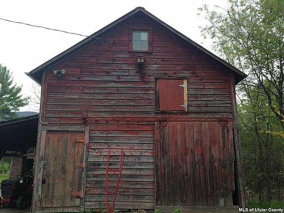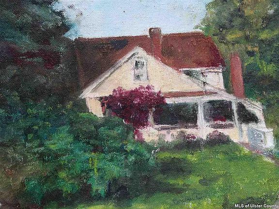 Quintessential Woodstock farm house and barn, complete with artists studio. Built in 1870 according to town records, although some documents suggest 1840, this Easton Lane beauty was home to mid-century Woodstock artist Daniel Revzan. Revzan was a skilled carpenter as well as a noted painter, and his carpentry graces the house throughout. Richard Freed, the current owner, built a studio attached to the barn which is insulated and heated. Walk through the handmade Revzan doors into a rustic kitchen with Revzan-built cabinets. The kitchen opens into a country dining area with built-in Revzan breakfront. Both kitchen and dining area are bathed in light from the skylights added by the current owner. The huge living room is the entire width of the house, with built-in book shelves, wood-burning stove, and wide-plank floors. Another stylish Revzan door leads to the front yard, where Freed created a bluestone patio. There is a separate entrance with mudroom to the left of the kitchen door, which leads to an office or guest room. Ideal for a therapist, masseuse, lawyer, architect. Freed is an architect as well as a painter, and his drawings adorn the desk. Upstairs are two large bedrooms and a walk-in dressing room/storage area/writing nook/playroom. The full bath upstairs and half bath downstairs feature more Revzan cabinetry and tiling. The barn is being sold "as is", but is quite sound and beautiful. The art studio is completely insulated and heated. There is also a chicken coop that currently stores wood, and an original two-seater outhouse. The shy acre is level with gardens and flowering trees and year-round mountain views.