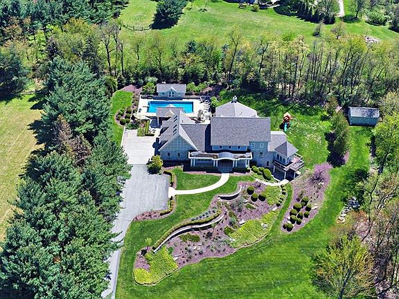 EXQUISITE HOME built with exceptional quality and attention to detail throughout the inside as well as the outside. Carefully sited on the 9+ Acres to enjoy the privacy this location offers. A wide open marble entry lead to the exceptional well equipped Kitchen w/ bronze appliances, Sub-Zero, Miele and Dacor Appliances. Large center island, granite counter tops and huge walk in pantry complete the kitchen. The kitchen opens to the amazing family room with gas fireplace, window seats and loads of natural light. Family room doors lead to the amazing patio space, outdoor fireplace, covered equipped kitchen and bar area with seating, heated pool and pool house with bathroom. Formal living and dining room offer great additional inside entertainment space. Exceptional 1st floor Owner's suite with sitting area that opens to balcony space overlooking the private serene property, den, luxurious bathroom w/ radiant flooring, soaking tub, steam shower along with large walk-in closet.