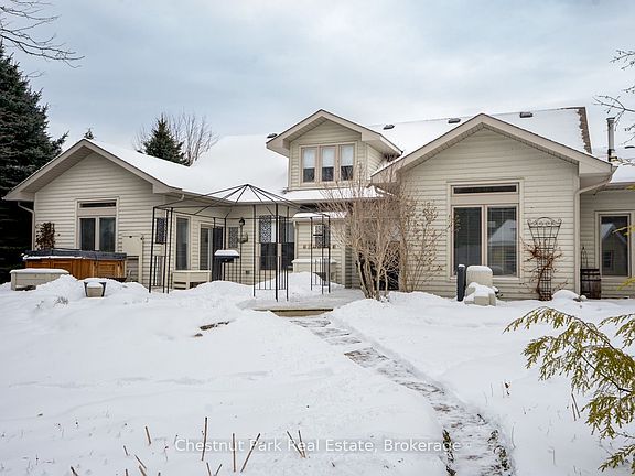 Imagine living just two minutes from Blue Mountain's ski hills, golf courses, shops, restaurants, and everything Collingwood has to offer. Hop on your bike and in 15 minutes you're riding the Pretty River Valley--one of the region's most scenic road cycling routes. Set on a private 1-acre lot in a park-like setting, this executive ranch-style bungalow with 2 car garage offers easy access to the area's best walking and biking trails, making it an ideal base for four-season living. Beautifully landscaped and surrounded by mature trees and perennial gardens, this home offers 2,532 square feet of finished living space, including 4 bedrooms (one currently used as a study), 3 full baths, and a cozy media room. Radiant in-floor heating and a split ductless system ensure year-round comfort. In the great room, a soaring 17.5 vaulted ceiling and wood beams create a sense of warmth and grandeur, anchored by a modern fireplace that draws you in. The open-concept layout blends the great room, gourmet kitchen and dining area, making it perfect for entertaining. Step outside to an oversized back deck with hot tub and covered gazebo--an ideal setting for relaxing or gathering with family and friends. A charming studio at the rear of the property offers a creative hideaway, whether for kids, artists, or as a private retreat. With space to add a pool or dedicated play area, this home offers endless opportunities for outdoor living. Don't miss your chance to own a slice of Collingwood's lifestyle--where comfort, recreation, and nature meet.