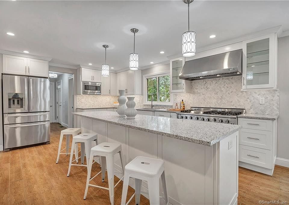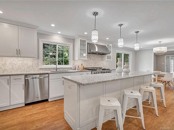 Incredible Value! Over 5,000 square feet in this spacious, updated 5 bedroom, 3 1/2 Bath colonial with over 2 acres on a cul de sac! Gorgeous remodeled kitchen - oversized quartz island & stainless steel appliances, open to family, living and dining rooms. Flexible floor plan with possible 1st floor master/in law (private entrance and separate driveway). Spacious master wing on 2nd floor: walk-in dressing room, expansive master bath and built-ins. Finished walk out lower level. Outbuilding with electric by 2nd driveway + play house. New windows, updated electrical, upgraded 5 zone heating and cooling system with Nest controls. 50 miles to New York City. Six miles to the Westport train station. Welcome to 2 Fairview Drive! A gracious front porch greets you as you approach the front door. Enter the elegant foyer... coat closet, powder room and access to the formal dining to your left and formal living to your right. Formal living room features hardwood floors, recessed lighting, crown molding and custom milled mantle above a wood burning fireplace. Formal dining room has french doors that open to family room - what a great way to expand your entertaining space. Family room with second wood burning fireplace, vaulted ceilings, skylights, built ins and wet bar. The renovated gourmet kitchen will excite the chef in you. Incredible oversized quartz island increases your prep space as well as allowing additional seating for those casual get togethers when everyone is in the kitchen. New stainless steel appliances, wine fridge, pendent and recessed lighting. Just off the kitchen is the laundry room - so convenient! Upstairs you will find 3 spacious family bedroom and a full bath and a complete master wing. Down a private hallway find the master bath to the right and the dressing room to the left. French door entry from both the hallway and the dressing room into the expansive master bedroom. Plenty of space to unwind. Vaulted ceiling, wall of windows, built ins, wall to wall carpet, ceiling fan and 2 additional closets. Finished space in the lower level adds even more entertaining options. Recently renovated throughout with today's pale palette and offering multiple flex spaces throughout the home. Come and see this fabulous house in an award winning school district. Just 4 miles to downtown Westport, 5.5 miles to the beach, 4.4 miles to the newly renovated and amazing YMCA.