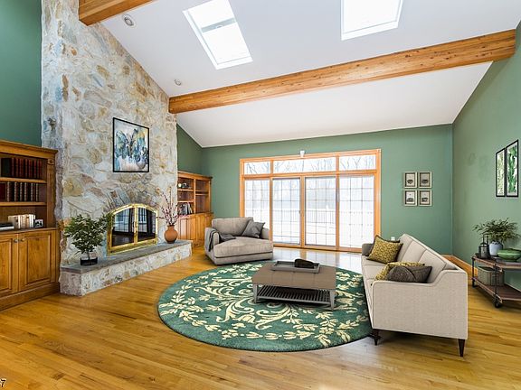Contemporary ranch with great curb appeal, generous spaces and flexible layout for a variety of uses to fit your needs. Angled rooflines and windows; two-sided stone fireplace, wood floors, exposed beams and custom built-in cabinetry. 28x14 Kitchen with granite counters, large center island, stainless appliances and light-filled eat in area with green house-style window. Incredibly spacious walk out lower level offers endless possibilities and features a media room with wet bar; den/office and exercise room; kitchen ; full bath and separate entrance. Entertaining-sized deck overlooks 4+ acre property with tree-lined backyard. Circular driveway, nicely landscaped. Pretty setting on a cul de sac in a wonderful, conveniently located neighborhood on the eastern side of the Twp near the Mendham border.