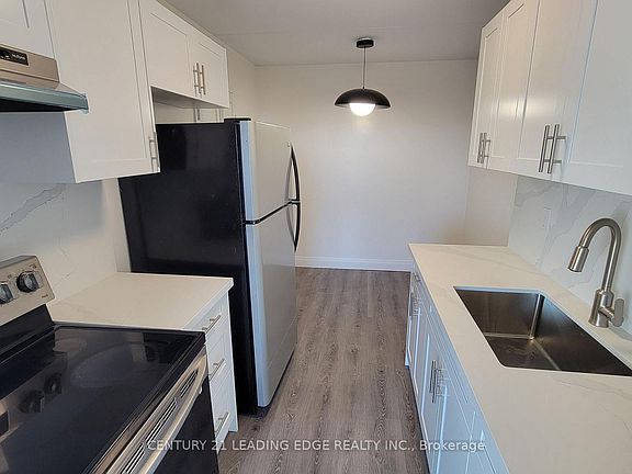 No stone unturned in this recently fully renovated bright and spacious south facing condo unit. This unit offers all day natural sunlight that shines through the end to end south facing balcony window where you can walkout to the large open balcony to enjoy the sunny view. Remodeled spacious kitchen with breakfest area, brand new, cabinets, quartz countertops, backsplash, all new plumbing finished with a Moen sink faucet. Includes stainless steel stove, fridge and hood range. Let's not forget the newly renovated bathroom, with the state of the art top quality vanity mirror, bathtub, all new vinyl flooring, new plumbing with copper pipes and moen faucets. High end light fixtures throughout, new mirror closets with convenient storage racks & shelves. All interior doors replaced, entire unit freshly painted including ceilings. The list goes on!!! Be the first to move in and enjoy all these brand new upgrades! This building comes with high reputation of cleanliness and low maintenance fees. Amenities include gym, library, party room & laundry room on the main floor. Lots of visitor parking & remote entry through buzzer for your visitors. Close to major highways, public transit and lots and lots of shopping!!! Don't miss this opportunity to move into this awsome home!!!