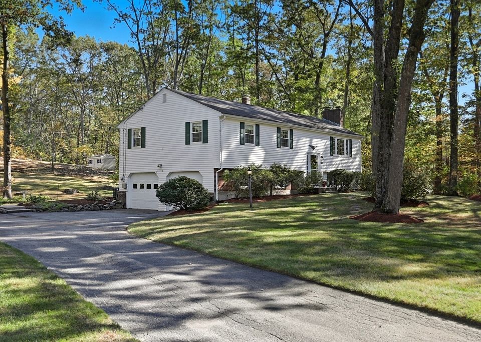 Situated on over an acre of beautiful land, this charming split-level home features 3beds, 1.5baths, and spacious 2-car garage. Move-in ready with expansion potential, inside showcases wonderful natural sunlight through its Harvey replacement windows, hardwood flooring, 2 fireplaces, and a warm & functional flow. Fully applianced kitchen displays ample storage w/ its oak cabinets, work station, mobile island & rear deck access - ideal for outdoor dining & entertaining. Primary bedroom offers 1/2 half bath & full closet. Spacious lower level family room could be used for array of options. W/D hookup in mechanical room. FHW heating & duct-work in place for AC. Two-Car garage offers additional storage / work-shop area. Expansive flat lot great for entertaining & for future growth. Peaceful local retreats include Harold Parker State Forest, Goldsmiths Woodlands and Fosters & Dug Pond. Easy access to 93, 125, & 114.
