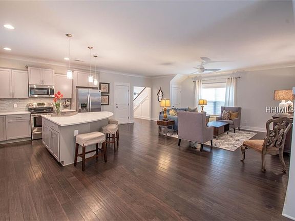 This spacious Richmond Hill C model has the optional 3rd floor with bedrooms 5 and 6. It also has upgrades which include a 3rd car garage, 4' garage extension, covered and screened porch, whole house spray foam, whole house gutters, deluxe owner's bathroom with shower and separate tub, second vanity sink in the owner's bathroom and secondary bathroom, kitchen island, 48" electric fireplace, additional patio, open rails with painted wood pickets, upgraded cabinets, crown molding, upgraded kitchen sink, luxury vinyl plank floors, 2" wood faux blinds and much more.