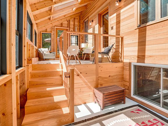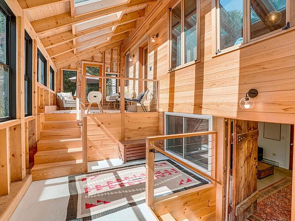 - Ins, MiniSplit, OSh, Floor 1: Open dining room and kitchen with a fireplace and custom wood finishes. Large living room with a wood stove and a door leading to a 528 square foot wood deck and outdoor shower., Floor 2: One main bedroom with ensuite bath and fireplace. Two guest bedrooms with a full bath.