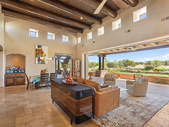 PANORAMIC VIEWS AND TIMLESS DESIGN IN LAS CAMPANAS. This refined residence in the Las Campanas community combines sweeping mountain vistas with many updates and enduring style in a hard-to-find 4 bedroom with a dramatic architecture. An inviting courtyard entry opens to generous living spaces framed by a dramatic sliding glass wall, creating seamless indoor-outdoor living. Towering viga-lined ceilings and plaster walls frame the spaces. The gourmet kitchen features dual Sub-Zero refrigerators, a Sub-Zero ice maker, and expanded storage. The owner's suite offers a quiet and spacious retreat, while a large media/game room provides flexibility for entertainment or relaxation. Recent enhancements include upgraded landscaping, refreshed interiors, and mechanical improvements that elevate both comfort and efficiency. Outdoor areas are designed for year-round enjoyment, with covered dining spaces, a pizza oven, and xeric, drip-irrigated gardens that are both lush and easy to maintain. Residents enjoy close proximity to The Club at Las Campanas, with spa, fitness, and dining amenities (membership available through the private Club at Las Campanas) as well as direct access to miles of walking paths. A move-in ready home blending elegant finishes, multiple upgrades, and the best of Santa Fe living.