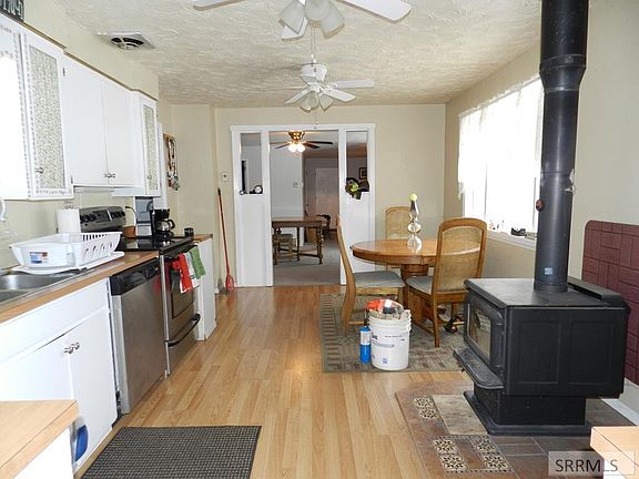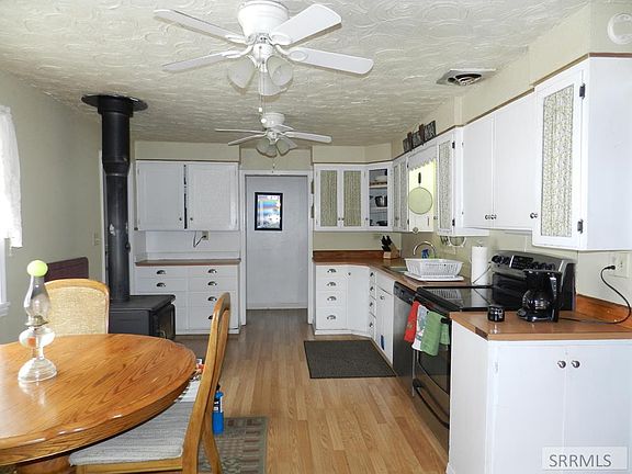 Charming Country Home. This handsome one-level 1,674sq ft, 3-bedroom 2-bath has been stylishly remodeled without sacrificing charm. Located on a corner lot with just under 3 acres of irrigated pasture ground for all your livestock needs. Features new carpet and laminate flooring. A sun-filled country kitchen with hardwood cabinets and wood stove lead to the formal dining area with floor-to-ceiling built-in cabinets and bay window to take in the amazing view. Entertaining-size living room with a large picture window and cozy fireplace. Large main level master with his-and-hers closets. Laundry and large pantry with tons of storage. Two bedrooms and baths to accommodate guests or growing family. Two separate garage/shops, a detached 66' X 18' garage/shop and 20' X 40' insulated shop with built-in workbenches, metal roof and siding, a lift master garage door opener and wood stove. Partially fenced with established trees, flowering shrubs and ditch irrigation to support the hayfield, along with 2 wells and 2 septics. Plenty of room for your RV. Come experience country living close to city amenities.