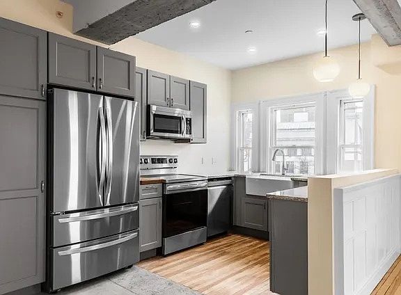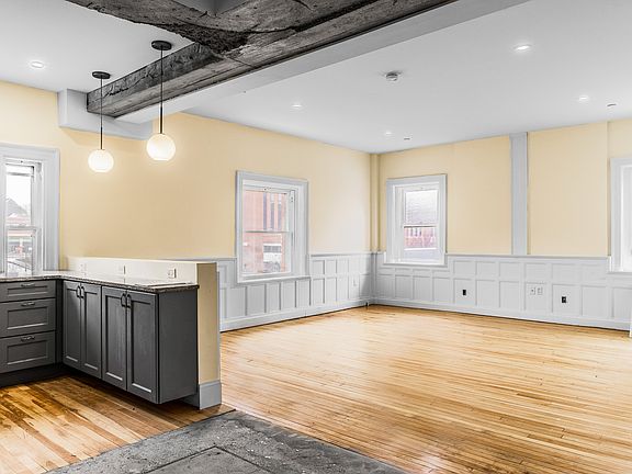 The historic and luxury lofts at 2 Hammond present eight unique apartments that have been thoughtfully designed around the historic bones of the Merrill Trust Building. Our 1 and 2 bedroom apartments are all corner units, with different in layout and special features, but all feature historic hardwood floors, designer black stainless steel kitchen appliances, kitchen islands with farmhouse sinks and garbage disposals, modern bathroom designs with separate soaking bathrubs and walk-in showers, in-unit washer and dryers, 10+ foot ceilings, and incredible natural light and views from the center of downtown Bangor astride the Kenduskeag Stream