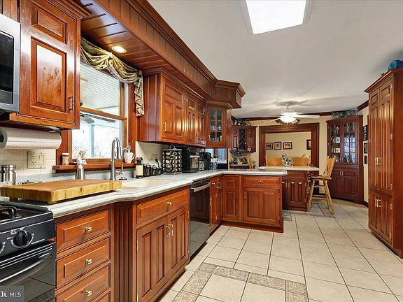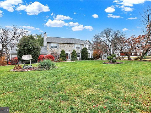 Timeless 2-story stone colonial, nestled on a corner lot. As you step through the front door, you're greeted by a welcoming foyer with hardwood floors that flow into the formal living room, dining room, guest half-bath and kitchen. Quaint features like pockets doors, bow windows, built-in wall cabinets and rich wood grains give a warm feeling of home. The heart of the home is the kitchen, featuring cherry cabinets, Corian countertops, backsplash, and a convenient pantry with organizers. The island, L Shape countertop, newer gas stove, built-in microwave, and refrigerator make meal prep a breeze. The adjacent dining room, with its tile floors and pocket doors to the family room, is perfect for hosting dinner parties. The addition to the home offers a versatile family room, a sun-drenched sunroom with skylights and French doors to the rear porch, and a luxurious master suite. The master suite boasts a spacious sitting room, a laundry area, a full bath with 2 sinks, and a dressing area with ample closet space. Two additional bedrooms, one with a walk-in closet & ceiling fans share a full hall bath. The partially finished basement, complete with a built-in gas heater, 30 year roof with 50 year Fish Scale Shingles, and ceiling tiles. The home also features a newer gas heating system, 2 central air units, water softener, U/V Light and 2 car garage with new (Fortress Floors) Polyurea Floor coating. Outdoor living is a dream with a covered back porch spanning the length of the home, equipped with 5 skylights, 3 ceiling fans, speakers, and recessed lighting. The upper (36 x12) and lower (26x16) Trex decks provide ample space for relaxation and entertaining. The in-ground pool, replastered in 2023, offers a refreshing escape, complete with built-in remote controlled lighting, a water fountain feature, and a flagstone patio. Two gazebos, a hot tub, and a pool shed round out the outdoor oasis. The remaining time of the warranties are transferrable for the garage floor, heater and air conditioning unit. Also, the American Home Shield Home Warranty is transferrable as long as the monthly payment of $181.84 is continued.