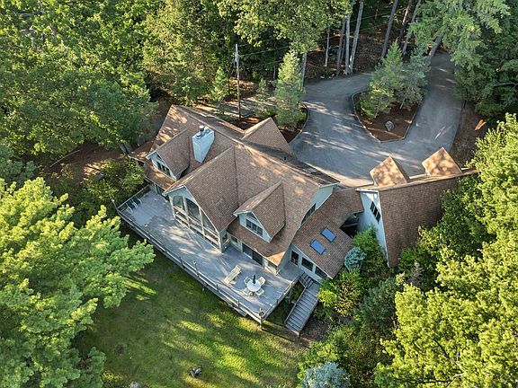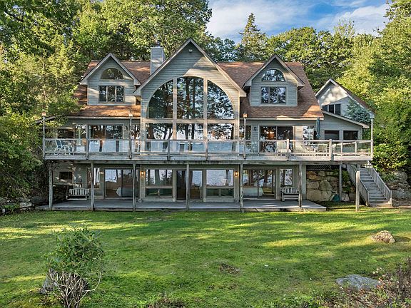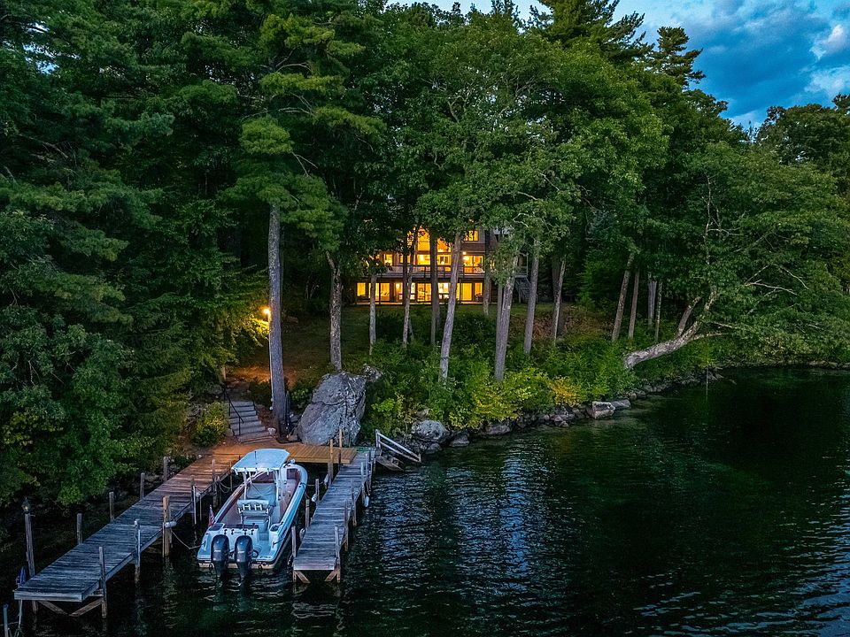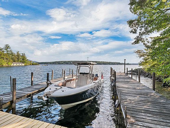 Discover the best of Lake Winnipesaukee living with this private waterfront home in Meredith, NH. Nestled on 1.5 acres with 205 feet of pristine shoreline, this single-family home offers both seclusion and convenience. Natural landscaping frames expansive southwesterly views across the lake toward Governors Island and Weirs Beach, while a U-shaped dock provides excellent boating access and stairs into sandy bottom swimming. Inside has a great floorplan, the spacious open design for entertaining, featuring soaring ceilings, a dramatic floor to ceiling wood burning fireplace, and a wet bar. The first-floor primary suite offers comfort and convenience with fireplace, access to deck, tons of closet space, a cedar closet, and a private office while two upstairs bedrooms each include en suite baths. A finished walk-out lower level adds flexible space for additional rooms, bathrooms, spacious family room, a second fireplace—perfect for hosting guests. The outdoor living is just as inviting, with a screened porch, 2 large front decks looking out at the water, and a circular driveway leading to a three-car garage with walk-up storage that could be expanded into more living space. Whether you’re gathering with friends or seeking a quiet escape, this property blends privacy, views, and modern lakefront living in one exceptional package. Close to Lakes Region amenities by boat or car including restaurants, shopping, hiking, skiing, golf, theaters and much more.
