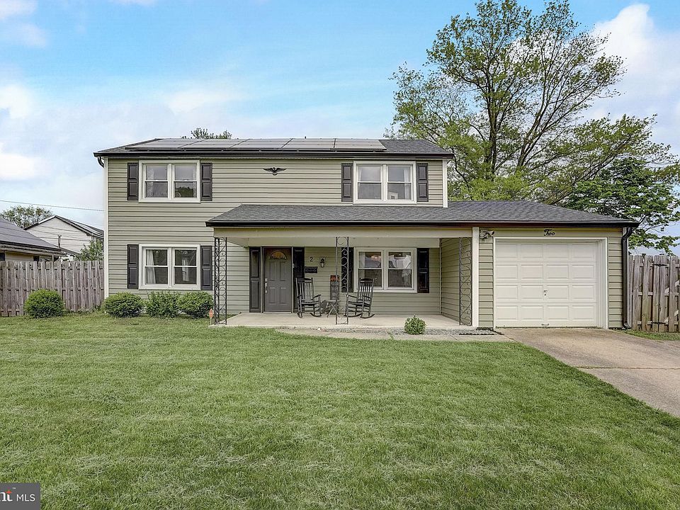 BE IN YOUR NEW HOME JUST IN TIME FOR SUMMER! Welcome home to this updated center hall colonial tucked away on a spacious corner lot in Hawthorne Park. Upon arrival, you are greeted by a covered front patio and well manicured lawn. Entering the home, you'll find sprawling luxury vinyl wood flooring that extends throughout the first floor of the home. The livingroom has been updated and features recessed lighting, and an electric fireplace with custom mantle as a centerpiece. The living room boosts several windows, allowing in plenty of natural light. Off this space is the eat in kitchen. The kitchen features an abundance of beautiful blue/grey cabinetry, with built in wine rack and beverage fridge. From the kitchen you'll also find SS appliances, tiled backsplash, access to the laundry room and access to the rear fenced backyard. Adjacent to the kitchen is a formal diningroom adorned with decorative moldings that provides access to the main floor bedroom. From this bedroom, you'll be able to access the storage space that was left in the partially finished garage. This storage space can also be accessed through the front garage door as well. This space provides plenty of storage for lawn equipment, decorations and more! Heading upstairs, you'll find a full bathroom in the hallway, and two ample sized bedrooms. The primary bedroom is spacious and offers a desirable en suite full bathroom, as well as TWO walk in closets! This home has had some major updates including new insulation in the attic, as well as newer siding, doors, windows and gutters that come with a lifetime transferrable warranty. You'll also benefit from the energy savings that the solar panels provide. With quick and easy access to major roadways and local shopping, there is little left to be desired here! Don't wait, make your appointment to see this home before its gone!