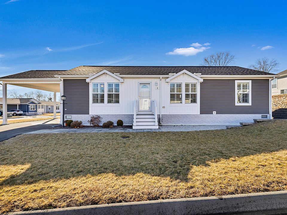 Located in the desirable 55+ Millwood Community - Come check out this bright, open-concept 2-bed, 2-bath modular ranch which presents easy, comfortable living. Enjoy plenty of natural light, a spacious kitchen with a large island, and plenty of storage space throughout. New shutters add a fresh touch, while newly installed towel bars, shower handles, and toilet paper holders bring added convenience and style to the bathrooms. The master suite features a walk-in closet and en-suite bath, while a second bedroom and full bath provide flexibility. Outside features a concrete patio and carport for added convenience. Schedule your tour today! Land lease is $643.50 starting April 1st. Includes: water, sewer, trash, recycling, portion of land taxes, common grounds maintenance, onsite management, street lights, and snow removal on the roadways. Home owner is responsible for yard maintenance and snow removal in driveways and walkways.