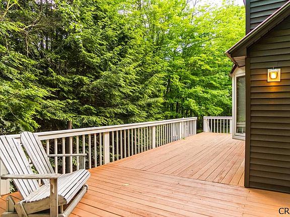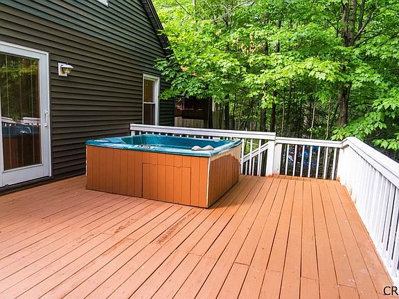 Newly remodeled cottage nestled in the woods boasts a brand new bathroom and kitchen with stainless steel appliances, gleaming hardwood floors throughout the first floor. 2 sliding glass doors open out to a 700 sq. ft. deck with a hot tub plus an enclosed porch gives extra spaciousness to the living quarters. Upstairs there's new wall to wall carpeting in the hallway and bedrooms. On demand Generec generator included for peace of mind. Year round country living at it's best yet affordable and turn key.