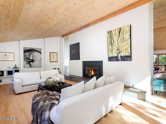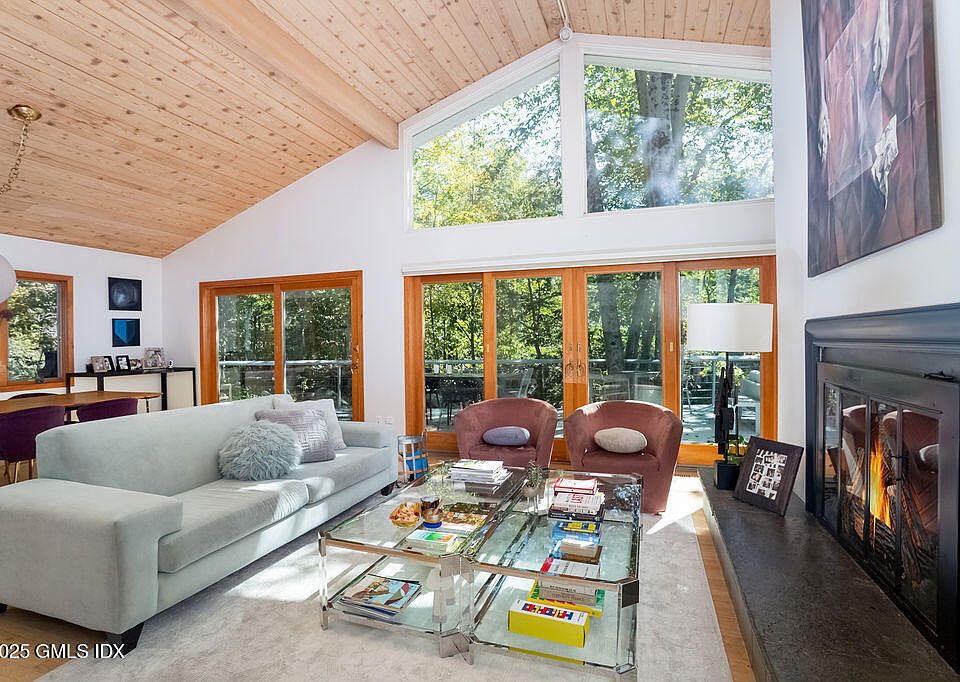 Nestled in a serene natural setting, this renovated contemporary features a large deck for indoor/outdoor entertaining and beautiful pond views from most rooms. The bright and sunny interior is filled with natural light from the oversized windows and sliders. The main level has an open floorplan with wood-clad vaulted ceiling, family room/dining room with fireplace and doors opening to the deck, eat-in kitchen, living room with fireplace, primary bedroom and renovated bath, and office with renovated ensuite bath that can also be used as a 5th bedroom. The lower level has 3 bedrooms, 2 renovated baths, a playroom and laundry. Just minutes from restaurants, stores, and the train.