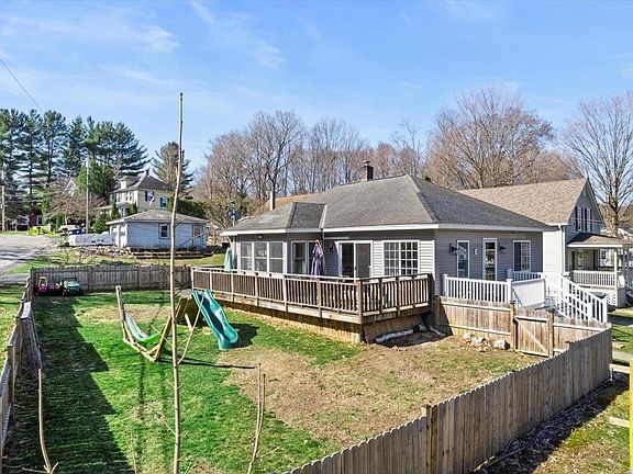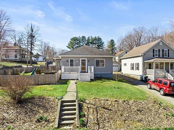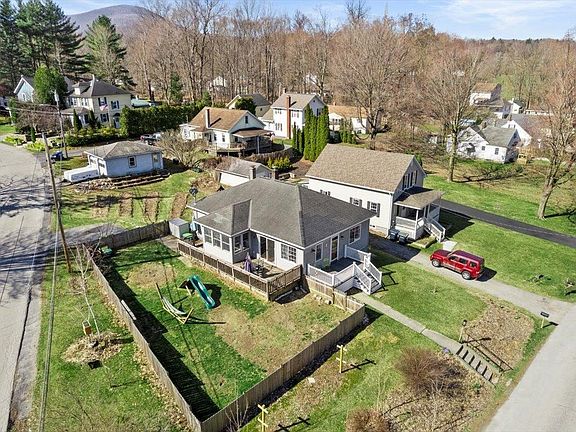 Absolutely perfect blend of charm + modern updates! Heat pump mini-splits were installed September 2022 to provide energy efficient heating + cooling throughout the house... dramatic savings! Kitchen and mudroom had a complete renovation in 2016, creating an open concept with dining area. Kitchen has GE Stainless Steel appliances, quartz counters, and timeless white cabinets. Adjacent living room is perfect for snuggling up to watch a movie or read a good book! Main level is surrounded with windows... the abundant sunlight does a mind and body good! Three bedrooms on the first floor (each with a mini-split, ceiling fan and closet) along with a full bath that has a tub/shower, vanity with granite top, and patterned tile floor. Lower level just had a huge makeover, adding approx. 600 sf finished living space including a large family room, 3/4 bath and office nooks. The unfinished section of basement has bulkhead to the backyard for easy storage access, laundry with sink, and utilities. 200 amp electrical, steam boiler (barely used anymore!), and electric hot water tank. Brand new TREX deck out front where you can listen to the sound of the river flowing across the street. Wooden side deck that leads to the fenced side yard, great for dogs. Backyard has established garden beds and a detached 2-car garage with electricity & workbenches (not insulated/heated). A stone's throw to the golf course or quick drive to everything in town!