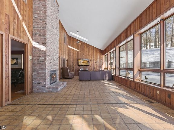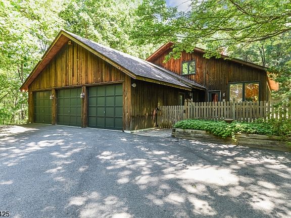 This contemporary Mendham Township home is nestled among the trees with picturesque views of the Roxiticus Valley. Located in what is considered one of Mendham's prime estate sections, this residence offers a tranquil setting and plenty of space to make it your own. At the center of the home is a living room featuring a double-sided brick fireplace shared with the extensive vaulted ceiling family room, where a wall of windows showcase the scenic property. These spaces are great for entertaining and flow nicely to the kitchen and dining room. The bay windowed dining room reveals spectacular views, and there are numerous windows throughout the home bringing in the sunlight from all angles. From the back hall near the kitchen are plenty of storage closets, one of the two powder rooms, and access to the three-car garage which accesses the yard and basement. On the opposite side of the home is a first floor owners' bedroom with and large walk-in closet and an en-suite bath featuring a walk-in shower. A second bedroom could serve as a nursery or home office. Completing the main floor are a second powder room, washer and dryer closet and basement access. Upstairs, two additional bedrooms offer a sitting room and an adjoining full bath. Each of these bedrooms has a walk-in closet. An attic can be reached from this floor. The full basement has high ceilings and stairs to the three-car garage above. Providing a prime location in the Hunters Glen neighborhood, the community is surrounded by the beautiful Roxiticus Valley. This convenient setting is close to Routes 206, 202 and Interstate 287. Enjoy outdoor recreation at Morris County and National Parks and trails, and the historic Schiff Nature Preserve. Mendham Township is also notable for its highly-ranked public schools.