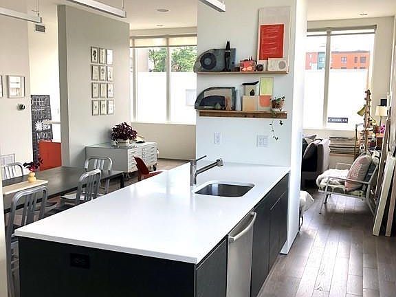 Delightful contemporary residence with open, airy floor plan enhanced with custom European finishes w/crisp, clean design. 10 ft ceilings, striking oversized 7 ft windows and 4 sunny exposures with dramatic Seaport and city views. Gas fireplace in living room. Wide plank flooring throughout. Italian kitchen cabinetry, stainless steel appliances,, large island with white Silestone countertops. High gloss built-in custom Italian wardrobes offer a unique abundance of storage. Sunny master bedroom with ensuite spa-style bathroom. Lovely second bedroom with many windows. Well appointed full second bathroom. Study area, home office off living room. Spacious exclusive roof deck w/SPECTACULAR 360 degree views. Large private garage w/direct entry to apartment. Central location near numerous amenities including gourmet food shops, restaurants, charming waterfront park. Additional storage closet space included. Separate utility room not included in SqFt.