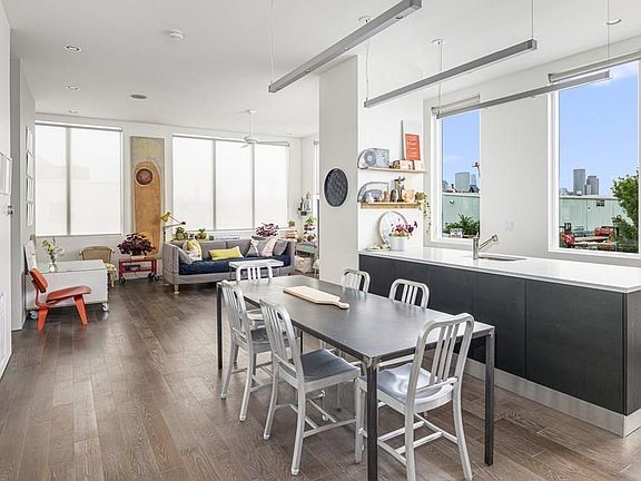 Contemporary residence located at corner of East First and I Street. With 1259 SF, this unit features 10' ceilings, 4 exposures of over-sized windows band the space with all day natural light ; Wide-plank flooring thru out ; Gas Fireplace featured in the main living area ; open to the beautifully appointed kitchen of Italian cabinetry, white silestone countertops, stainless steel appliances and a large island, perfect for meal prep or entertaining. Master Bedroom features a spa like en-suite bathroom. Spacious Guest bedroom, with large windows, provides amazing light and brightness doubling as a home office. Roof top garden ; private roof deck with 360 views of Boston + beyond ; One garage parking space with direct entry into unit.