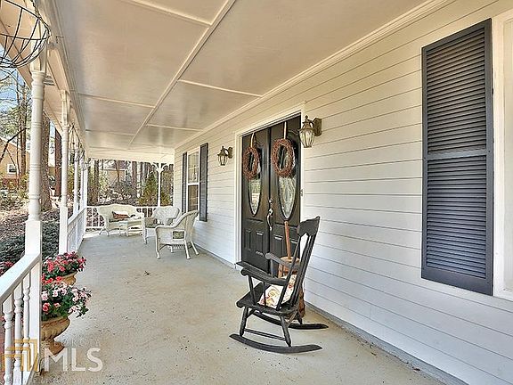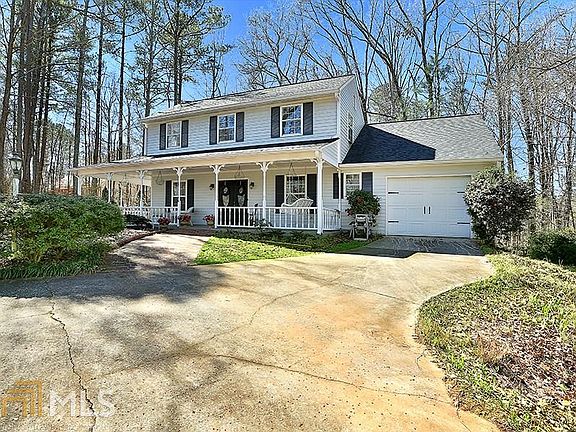 CHARMING HOME W/ HUGE WRAP-AROUND FRONT PORCH ON WOODED LOT! Great city location w/ a country feel...enjoy a peaceful moment on front porch swing! Foyer entrance opens to Family room w/ cozy fireplace, laminate hardwoods & bedroom/full bathroom on main. Tiled Kitchen w/ tall ceilings, plenty of cabinet/counter space SS Frig & breakfast room. Formal Dining room. Upstairs landing splits off into 2 large bedrooms w/double closets & full bathrm. Large lot w/small fenced area & beautiful woods beyond. Oversized closet in garage-great for storage. Extra parking pad for convenience. Home just pressure washed & NEWER ROOF! Best location near shops/restaurants of Ashley Park, Grocery, access to I-85 & Atlanta Airport! Must See...