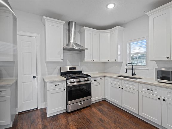 Contemporary cabinetryUpdated bathroomBright finishesFarmhouse-inspired hardwareStainless steel appliancesSleek quartz countertopsCorner lot
