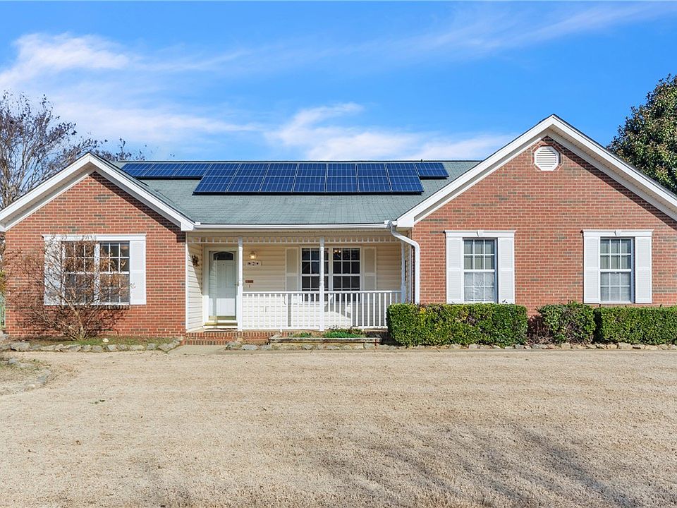 Roses are red and real estate is neat, at 2 Jonagold Court, the future's complete! This charming 4 bed, 2 bath brick ranch home has been meticulously cared for & is ready for its new homeowners. Walking into the front door you are greeted with an open concept floor plan. After passing the formal dining area on the right, be sure to take note of the vaulted ceilings and natural light that fills the space. Before reaching the kitchen, you will find two guest bedrooms and a secondary bathroom across from the dining area. Reaching the focal part of the home - you have a combined living and kitchen space. The kitchen is equipped with tons of countertop space for prepping and more than enough cabinets to ensure you have plenty of storage. Off the kitchen is a walk in pantry which leads to your one car garage. When entering the garage, you will find a separate laundry room on the right. This room is extremely spacious and could even be used as an additional workspace or utility room. Moving back towards the kitchen you will find your primary suite secluded on the right side of the home. Double vanity , garden tub, and a walk in closet are just a few highlights of this room. Now, to the real star of the show is the heated & cooled sunroom, which sits at the back of the house. Take in views of your private, wooded lot or head out to the covered patio for some fresh air. As if you didn't have enough storage space already - there are 2 outbuildings that will convey with the purchase of the home. 2 Jonagold Court is a quick 10 minute drive from Bridgeway Station & only 15 minutes away from I-85. Seller is willing to pay off the remainder of the solar panels balance.