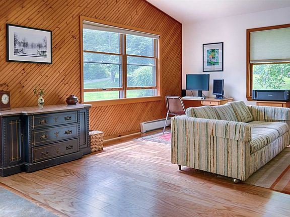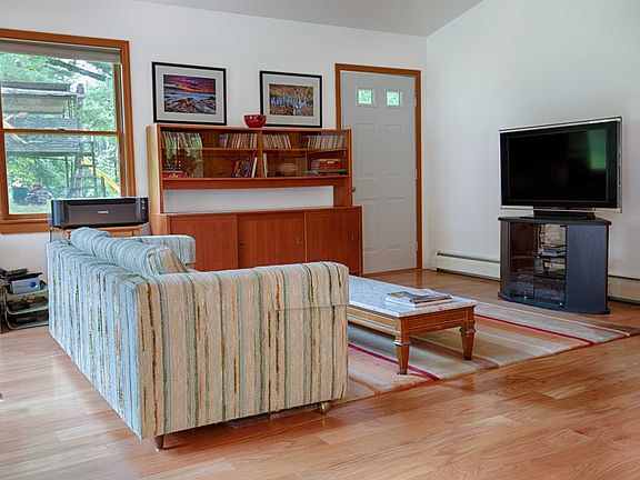 Clean, simple and cool contemporary with light open feel and just minutes from Rhinebeck Village. Quiet peaceful setting on a little lane bordering nice woodlands. This home features a great big open eat in kitchen and living room with vaulted ceilings. Master bedroom and bath, second bedroom and bath plus office, which could be third bedroom. New stainless appliances, hardwood floors, and nice deck complete the picture! This is a great weekend getaway home or live here year round!
