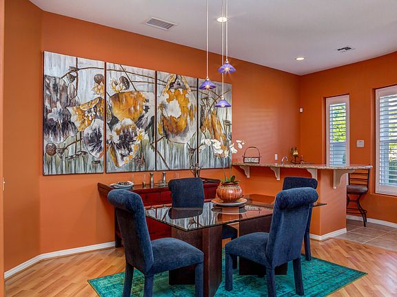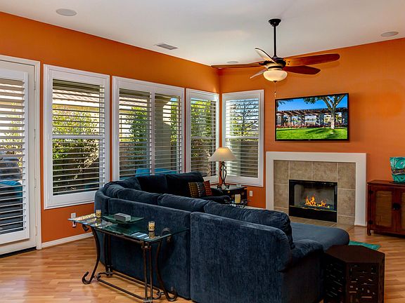 Corner lot within gated Mission Shores!! Panoramic western mountain views from the front. Private back yard with newly resurfaced pool/spa and efficient variable speed motor for ''spool'' and fountain. New plantation shutters throughout, new leased solar (Renova) $125/month. NO Bills in 2019. Low HOA includes Mission Hills Club Social and Dining Membership with option for tennis, pickle-ball, fitness and croquet. 3 bedrooms, all with baths. Great room floor plan with gas fireplace and corner wet bar. Bright colors throughout with exciting accents! Easy to show with short notice.