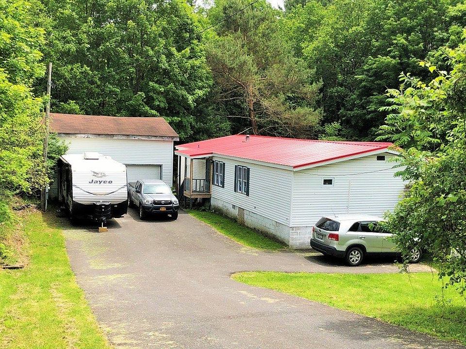 Edge of the village home with 3 BD, 2 baths on a large private lot. Open floor plan with newer flooring, one bedroom w/new sheetrock and a new roof in 2017. Spacious 2 car garage with room for a workshop and 2nd story storage, 2 storage sheds, patio and deck plus a newly paved driveway.