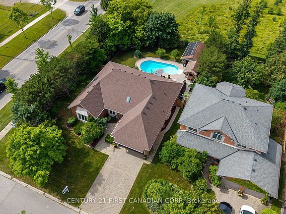 Welcome to your dream home in one of Byron's most coveted neighbourhood's, nestled on a quiet street and backing onto the serene Somerset Woods. This expansive bungalow offers over 4,200 square feet of beautifully finished living space and an unbeatable location just steps from the Byron Optimist Sports Complex and minutes to shops, restaurants, schools, and more. Step inside to discover an impressive and functional layout featuring formal living and dining rooms ideal for entertaining. The heart of the home is the bright, oversized kitchen complete with newer stainless steel appliances, ample cabinetry, and an additional dining area that flows seamlessly into a spacious family room with cozy natural gas fireplace and large patio doors leading to your private backyard oasis.The main floor showcases a massive primary retreat overlooking the serene backyard and has a beautiful skylit 4-piece ensuite, filling the space with natural light. Two more generous bedrooms, a second full 4-piece bath, convenient powder room, and a beautifully updated laundry room round out the main level. The fully finished lower level, professionally remodelled in 2017, is an entertainers dream featuring two large bedrooms, a stylish 3-piece bath, expansive recreation room, and an adjoining games area complete with pool table and full bar. Step outside and prepare to be wowed! The backyard oasis includes a solar-heated inground pool, a hot tub, and a detached 12x21ft workshop currently used for pool equipment. A poolside cabana and bar offer the perfect setting for summer entertaining and relaxing in complete privacy, surrounded by nature. Don't miss your chance to own this extraordinary bungalow in Byron a rare blend of size, style, and the perfect setting. Book your private showing today!
